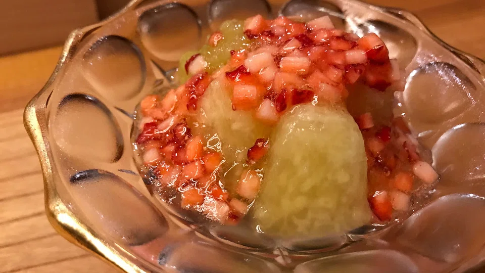 After a simple ochazuke or rice in hot dashi with seaweed and umeboshi plum marinated in honey, the meal ends with delicate Shizuoka musk melon and finely diced Nagoya strawberries in a honey jelly. Petit fours of red bean jelly (Japanese nonya kueh) and chewy sakura macaron are a final flourish.