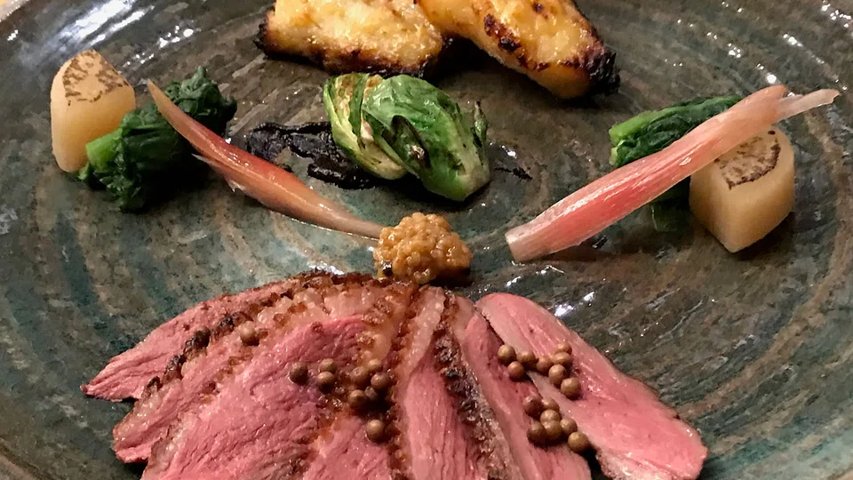 A main course of miso cod and grilled French duck features aggressively marinated fish that's tamed with the acidity of pickled ginger flower, and slightly tough duck slices that's more interesting for its condiments of Cambodian peppercorns and moromi - fermented soybean mash that's the precursor to soya sauce.