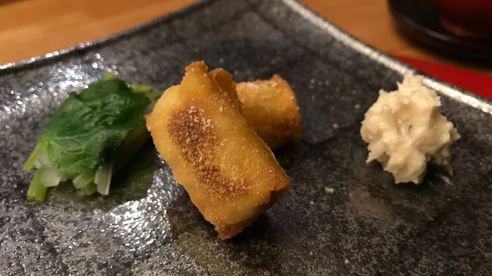 Chef Takayama rather coyly describes the next course of snapper shirako as "Japanese popiah" - actually deep-fried spring roll skin encasing a dangerously hot, molten blob of creamy milt. Simmered wasabi leaves and stems sit on the side, along with a dab of rich paste made of wasabi leaves cooked in sake lees and miso.