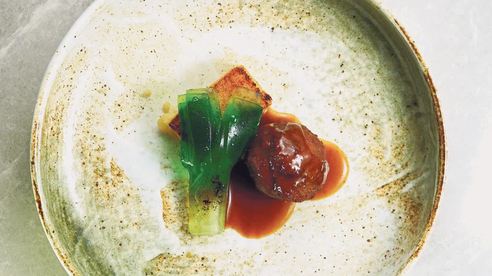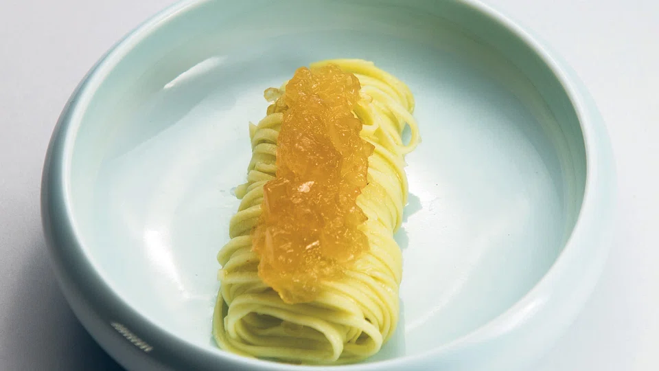 On the menu were dumplings made from different starches, filled with vegetable cellulose flavoured with extracts; "shark's fin" made of agar agar and an extraction of dried seafood in a chicken and pork knuckle broth; longevity noodles made of gluten-free starch topped with the essence of rice wine and chicken; a "Lioness Head" meatball made of gluten and "leeks" fashioned out of agar agar and colouring. Dessert was an impressive meringue shell made of albumin and agar agar, filled with sorbet and espuma, and a crumble of coconut fibre, salt, oil and sugar.