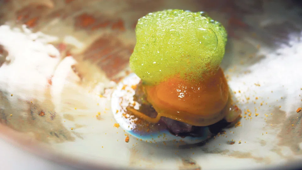 So instead of using oysters, cabbage, leek and eggs to make an oyster pancake, "we pan-fried pure starch to achieve a smoky crispness, and combined it with a flavourful gel and evocation (flavour compounds) that capture the taste of the sea". For chefs whose main vocation is to work with good quality produce, the process was "stressful but fun".