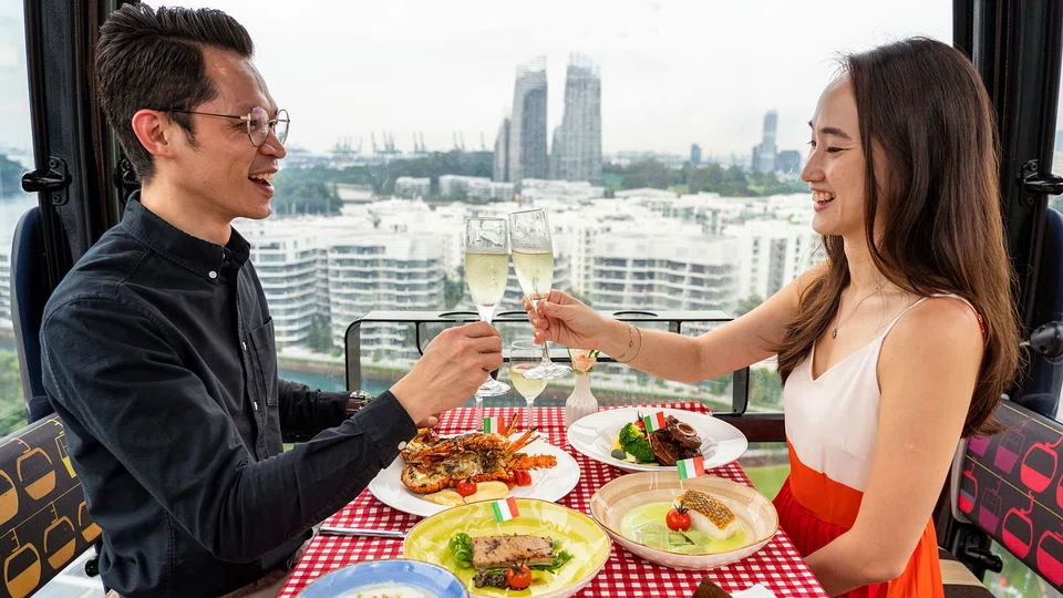 One Faber Group which runs Cable Car Sky Dining is offering a one-night only four-course Valentine's Day menu which includes crab and Roma tomatoes on cheese bruschetta, followed by a squash clam veloute.