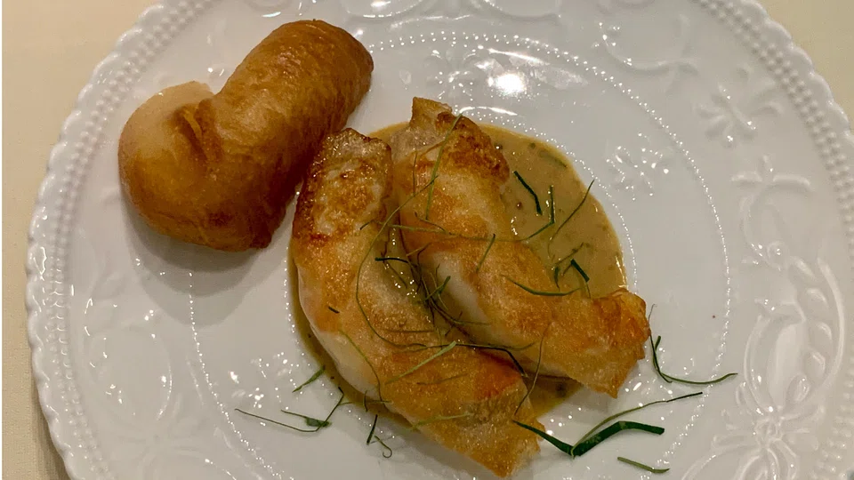 But the best part of the meal for us is the next dish - despite its nondescript description as 'Wild Red Prawn and Hae Bee Hiam'. This is where chilli crab aficionados look for diversity and find it in Japanese red prawn wrapped in rice paper and deep fried, lounging in a creamy dried prawn aioli made with prawn heads for good measure and sweetened with palm sugar. Shredded kaffir limes add a citrusy whiff while deep fried home made mantou gets hero status when dunked into the aioli and devoured.