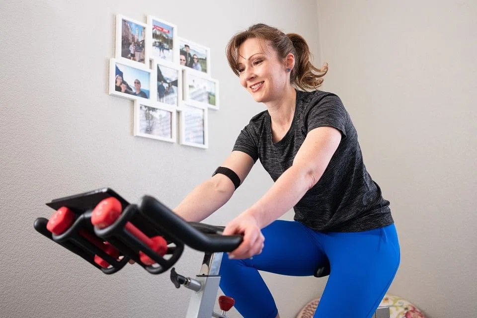 Using her own iPad, she has the flexibility to choose whatever fitness apps she wants to use, such as Zwift and mPaceLine. It also gave her the freedom to customise her bike, so she swapped out the stock pedals for better ones.