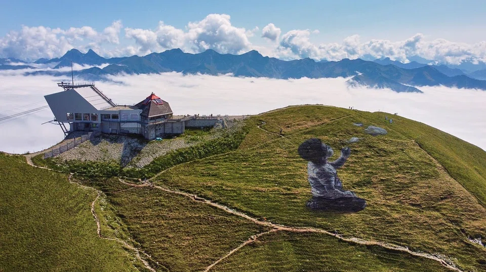 The 1,500 square metre painting Un nouveau souffle (A New Lease on Life) by French artist Saype, 32, graces the summit of the Moleson peak in the western Swiss Alps.