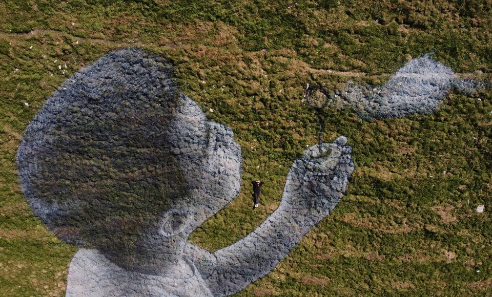 Known for massive works of graffiti on grass best seen from the air, Saype has also adorned sites ranging from an impoverished shantytown in South Africa to the lawn in front of the United Nations' European headquarters in Geneva .