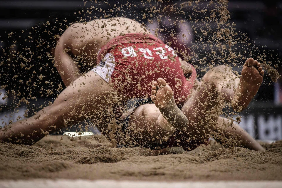 A ssireum match has some similarities to Japanese sumo but begins with two wrestlers facing each other on their knees in a sandpit ring, holding onto a cloth sash tied around the waist and using their strength and technique to knock the opponent to the ground.