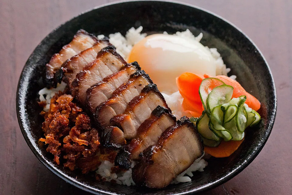 I experimented with a take-out concept called Bazuka Yakibuta, and I have two outlets now - one at National University Hospital and one at Great World City. What I did was I took char siew roast pork rice and branded it to look very sexy, cosmopolitan, and like a foreign chain. I served the meat with short-grain rice and pickles, and you can add an onsen egg that's sous vide at 63 degrees, so each bowl is S$10.80.
