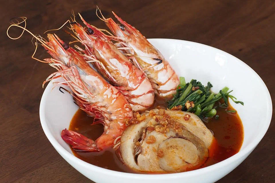 We do the Penang style of frying the shells first before blending it into pulp and boiling the soup, but the difference is we use the entire prawn instead of just the shells. We fry the whole prawns, pound them up, then make the soup - altogether it's an eight-hour process, and we use three types of expensive prawns. Then we serve with grilled prawns on top.