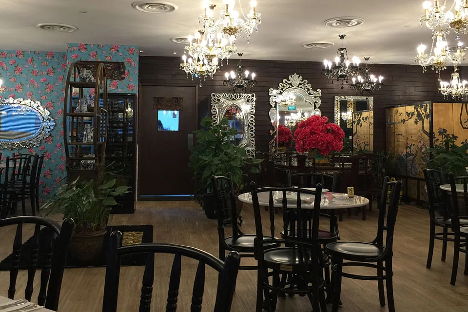If you have a chandelier fetish, you've come to the right place - the ceiling looks like a halfway house for runaway lighting fixtures. And we haven't even mentioned the display shelves of blue-and-white crockery, tiffin carriers, kettles and thermos flasks. Or the golden carved ornaments stuck on black pillars.