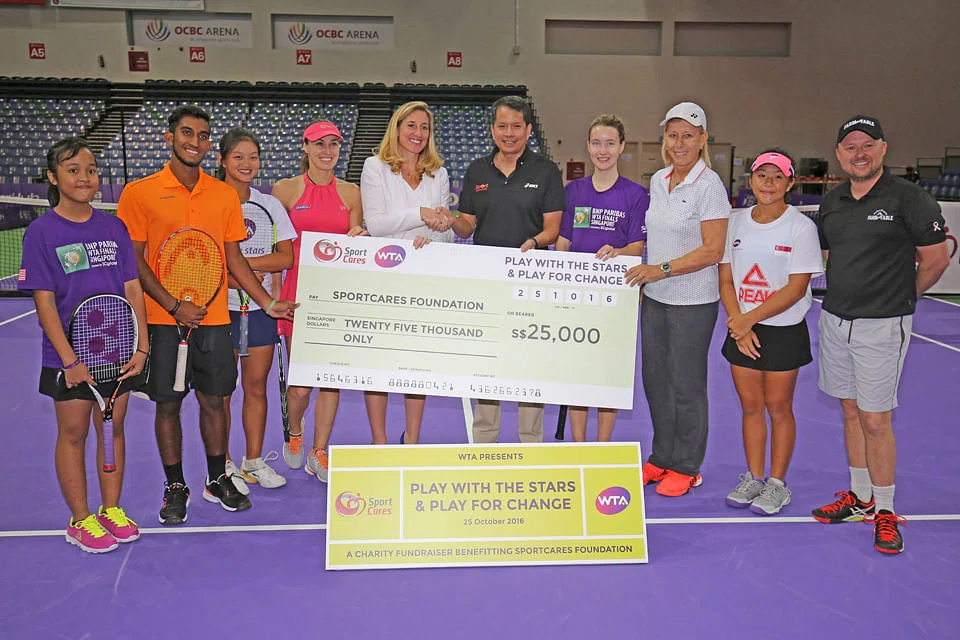 Former World No 1 stars Martina Hingis and Martina Navratilova play at charity event to help raise S$25,000 for SportCares Foundation