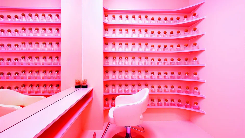 In the wash area, or Wash Cave as it is called, digital 'aquatic art' is projected on the walls, supposedly to restore your sense of wellbeing. If you are a VIP client, you get access to the Rose Quartz Private Room, an entirely pink room. The turquoise exit is a prime spot for taking selfies with your new hairdo.