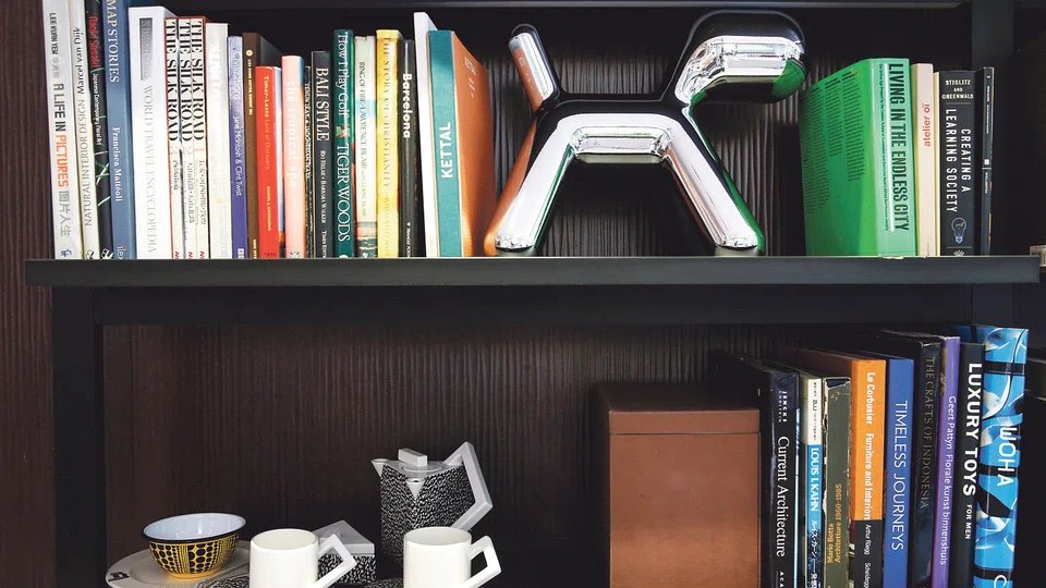 Yet, his home doesn't feel or look like a showroom. For example, the bookshelves are filled with his collection of architecture and design books, interspersed with designer accessories such as the Juicy Salif lemon squeezers from Alessi, and two Puppy plastic dogs from Magis.