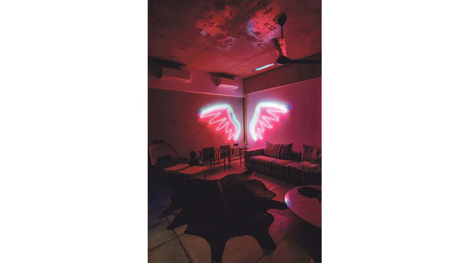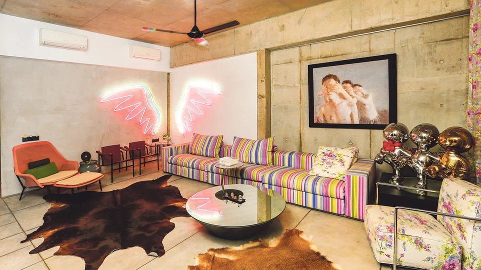 In the living room, the floral curtains are paired with a striped sofa in shades of pink, purple and green. In the corner of this room, there is a bespoke neon light installation of a pair of angel wings, which are lit up when there are guests. And when Mr Yong draws the curtains, the room gets a purple glow. "It is always my dream to have a purple room. People ask why, and I ask them back, why not?," he says.