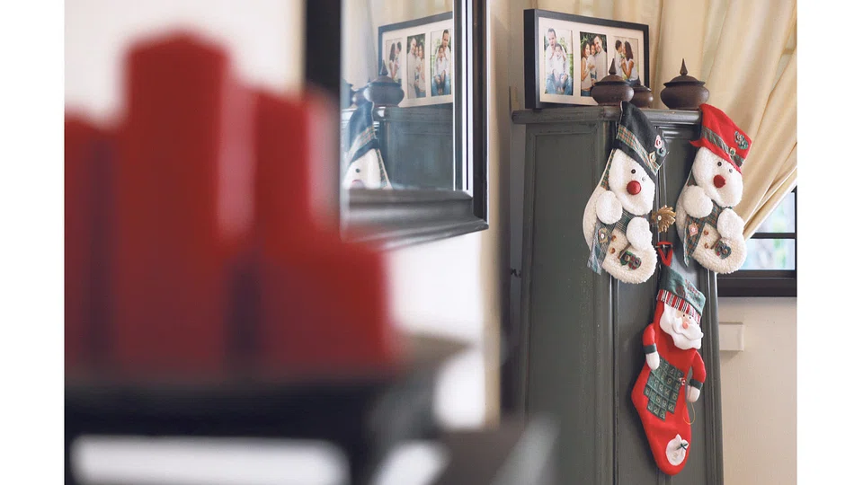The banister leading to the upper floors of their terrace home at Upper East Coast is adorned with Christmas socks, lights and red and gold baubles. "Nick is the engineer, making sure that the lights work and nothing falls off, while I design the overall look."