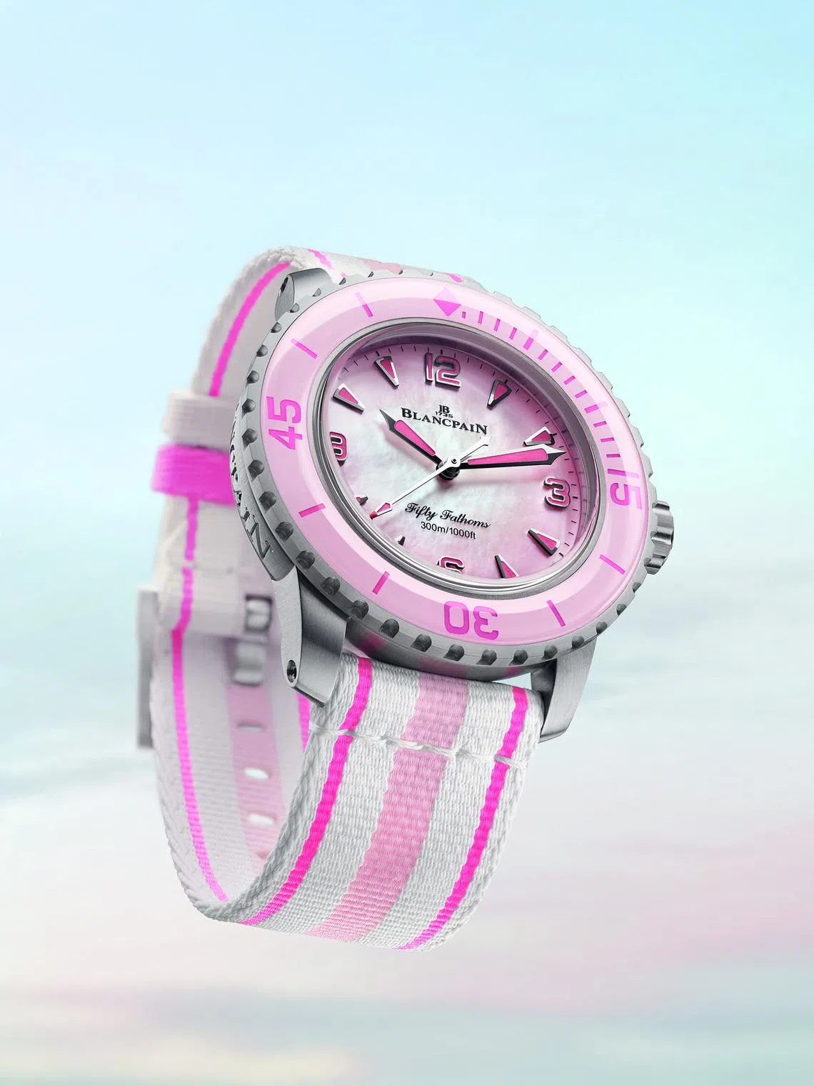 But look closer and only Blancpain’s name is visible on the watch’s pink dial made of mother-of-pearl. Its matching pink bezel is not encased in plastic synonymous with most Swatch watches, but high-tech titanium.
