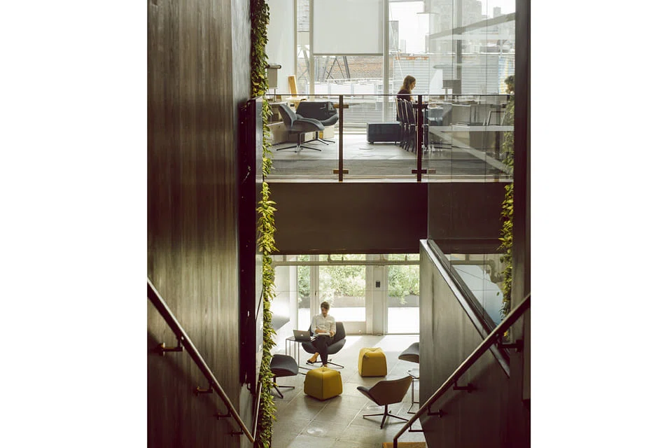 Standing desks are everywhere, and a wide oak staircase stretches between the lower and upper floors, encouraging staff to walk up and down rather than take the elevator - all contributing to fitness.