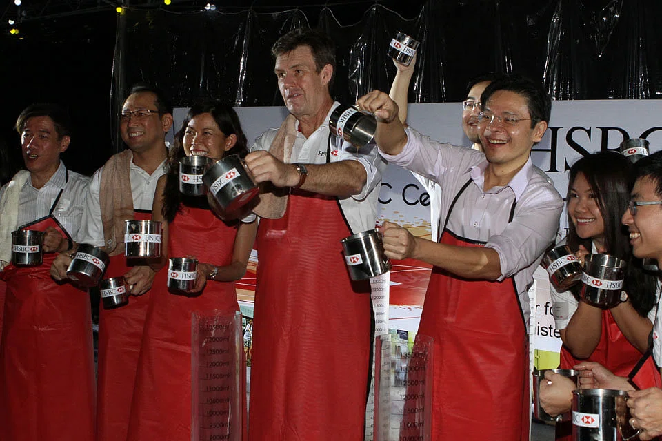 The teh tarik, or "pulled tea", event saw Lawrence Wong, Minister for Culture, Community and Youth, and HSBC chief executive Guy Harvey-Samuel lead teams of HSBC staff in a fast-paced relay match.