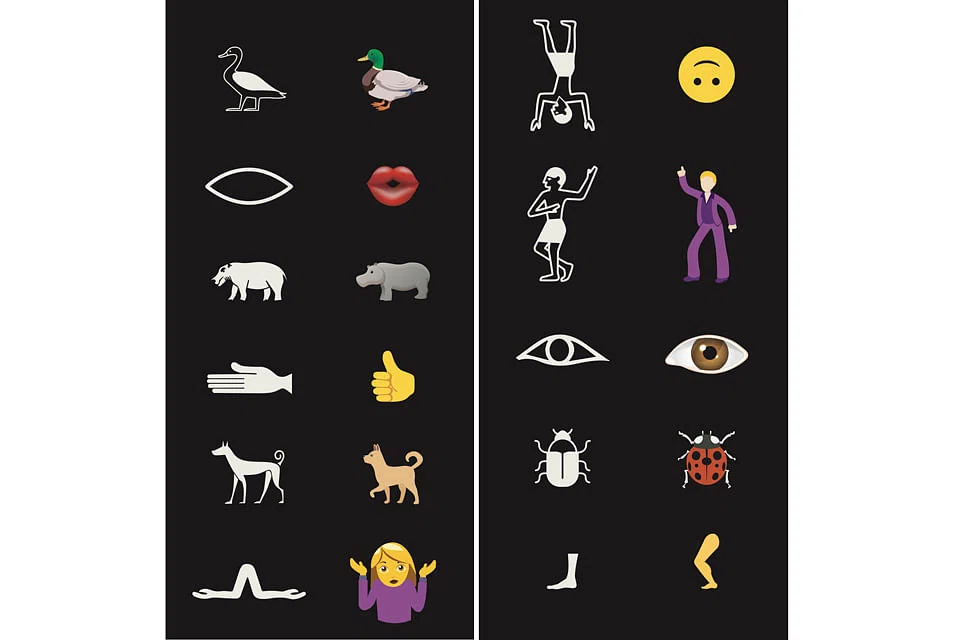 A chart at the entrance of the exhibition pairs a column of hieroglyphs with a column of emojis. The similarities are uncanny: There's no need for translation.