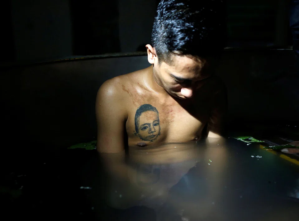 [PURBALINGGA, Indonesia] Rizki Mulyadi sits half-submerged in a steaming herbal bath, hands folded in his lap and head down.