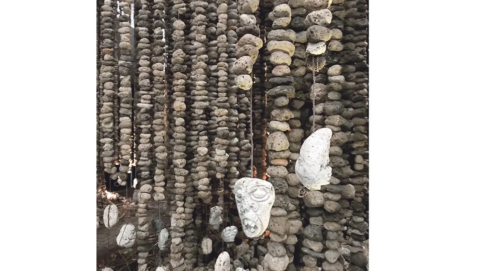 Among the sterling Indonesian artists is I Made Djirna, a Bali-based artist who amassed more than 6,000 pumice rocks. He then carved faces on them, tied them together and hung them from the ceiling. He's created a house-like installation entirely out of these rocks with faces. He invites you to enter and commune with these agglomeration of "souls".