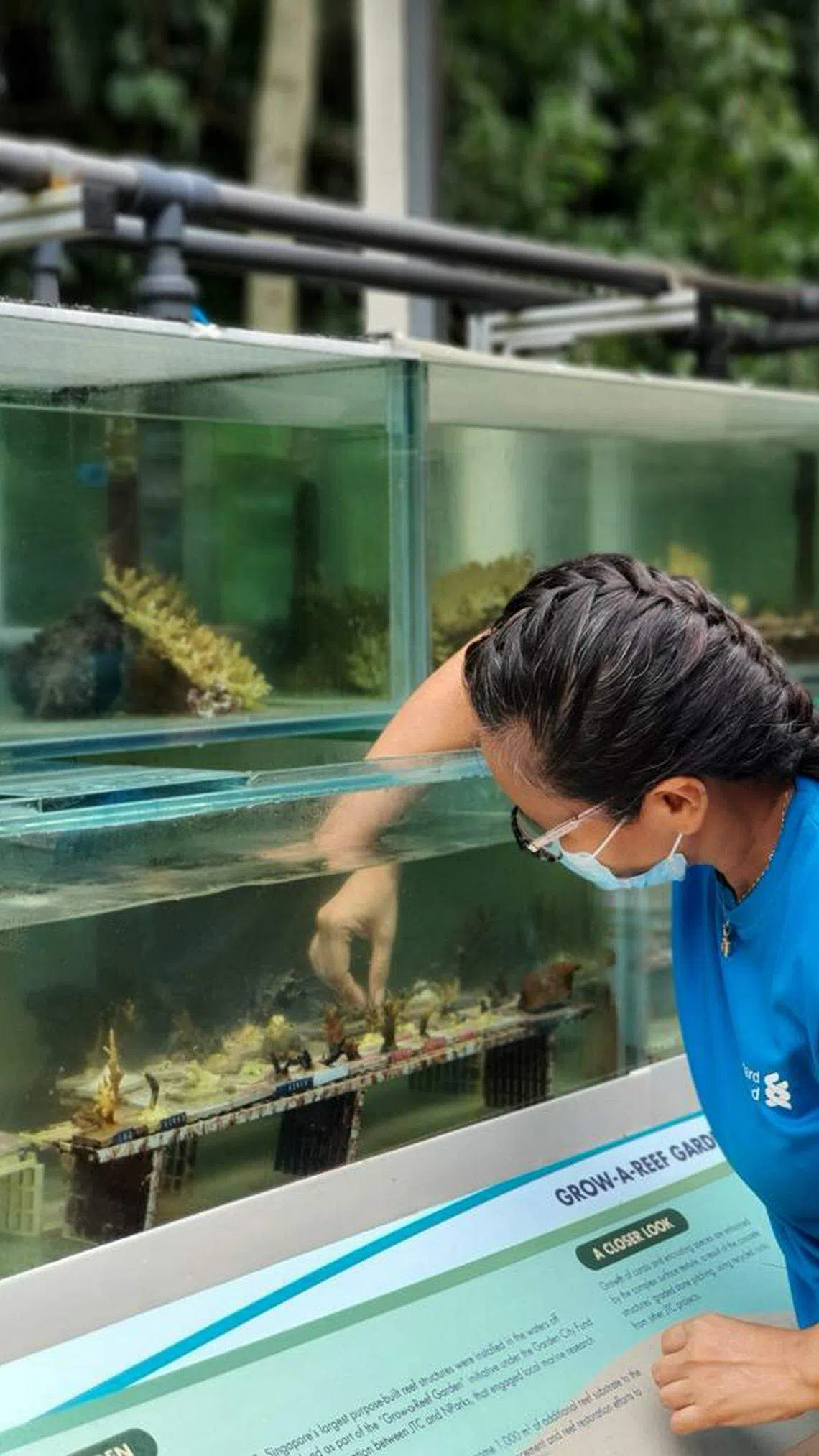 This includes scrubbing and removal of algae from the tanks and growing coral fragments. The fragments are maintained to allow them to grow into larger fragments and healthy enough before they get out-planted within the Marine Park.