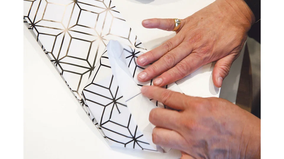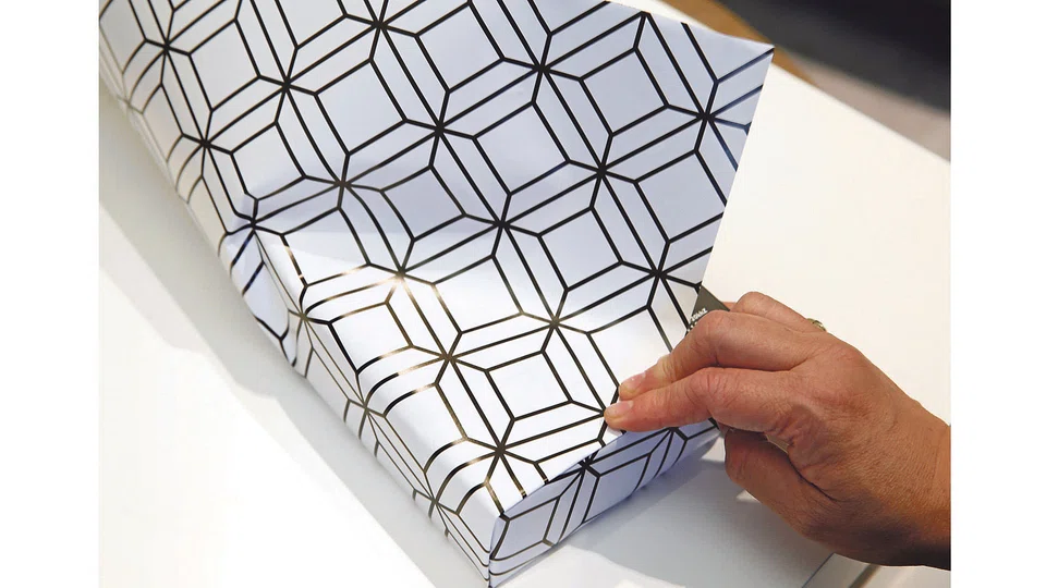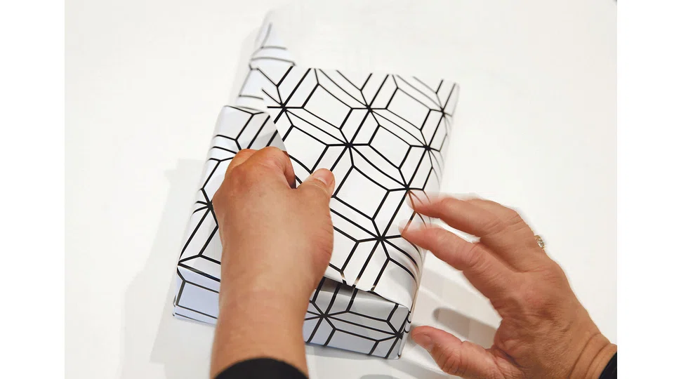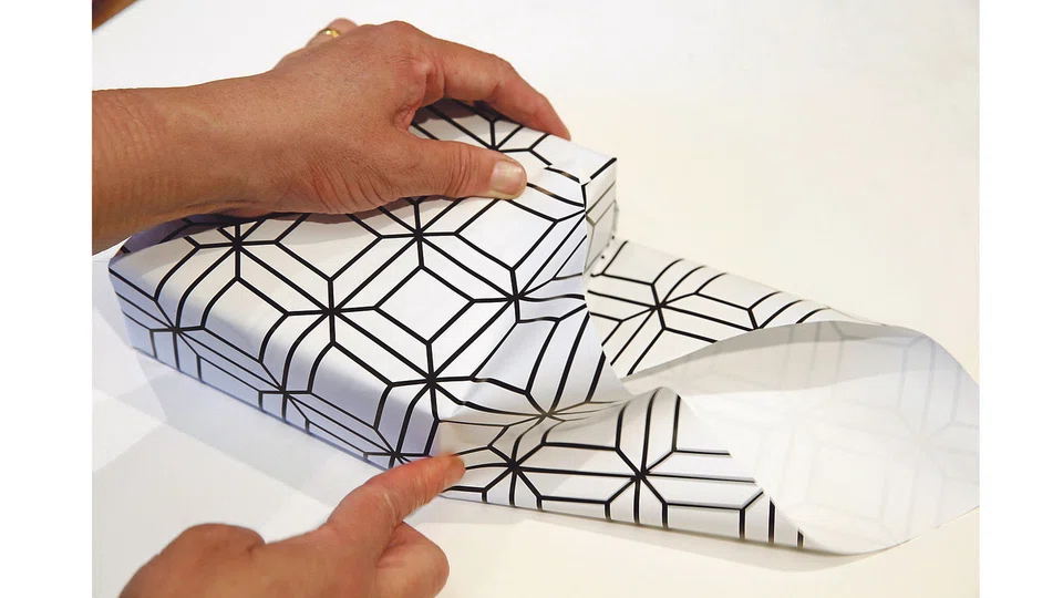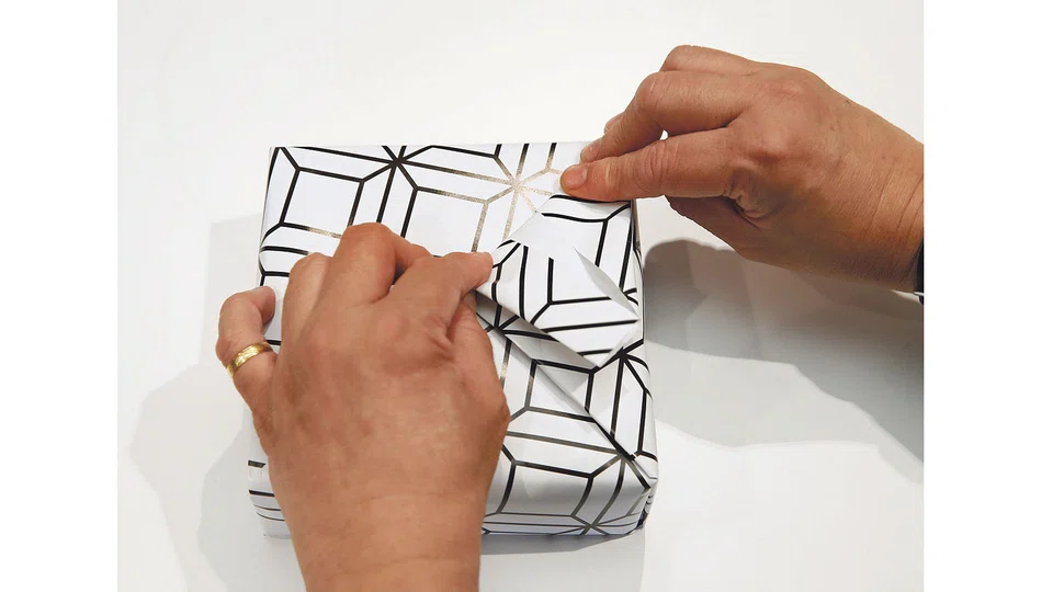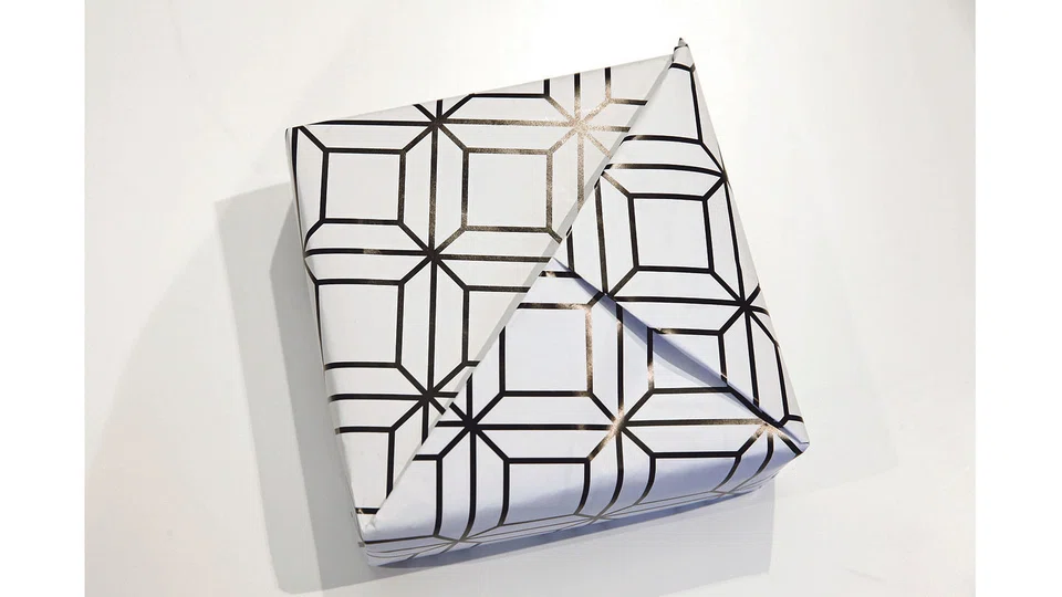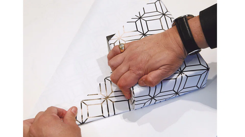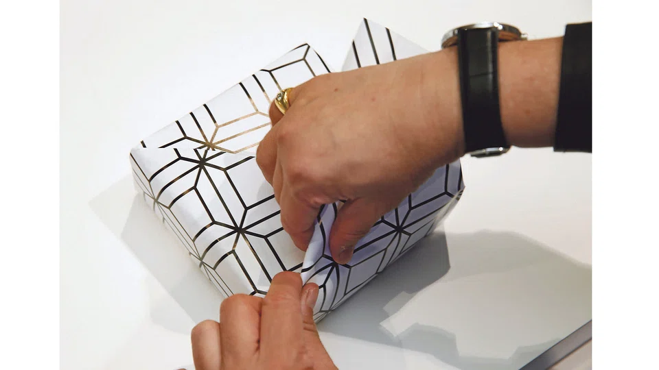 01. Place the gift on the wrapper and measure out the paper needed. The two edges should cover the gift.
