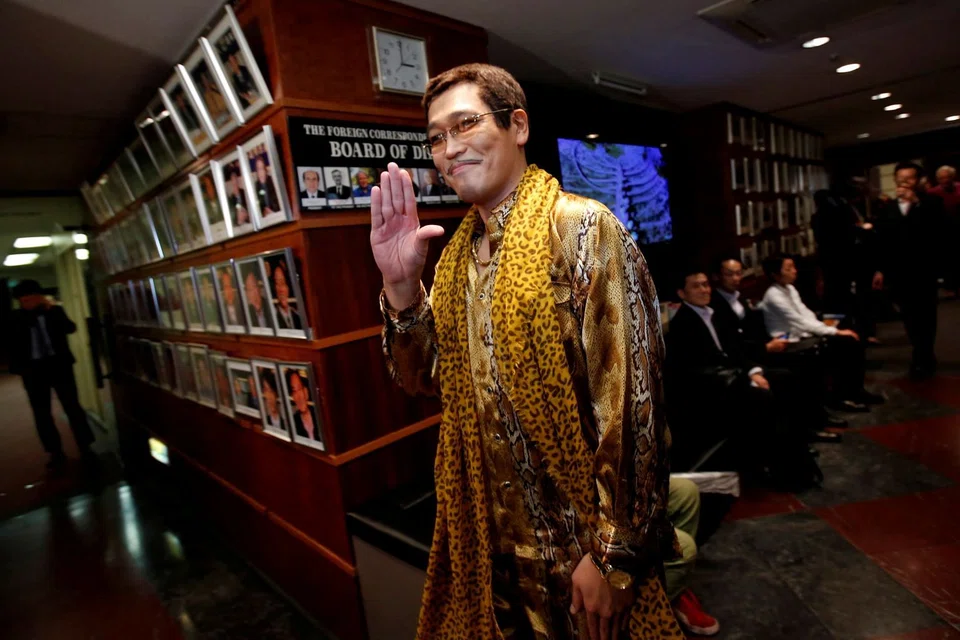 Pikotaro, whose real name is Kazuhito Kosaka, wore the same gold animal print outfit he wore in PPAP video that went viral in 2016.