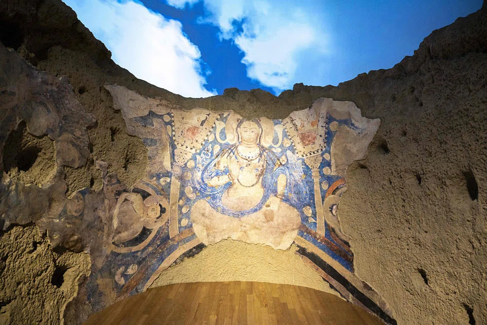 The mural on the ceiling of a cave near the famous statues depicted a blue Bodhisattva - or someone on the path to becoming a Buddha.