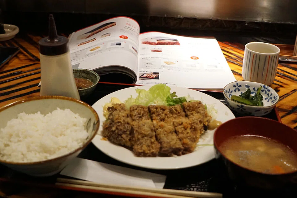 Whale steak is the most popular dish at 980 yen (S$12.35). A thin rectangular piece of meat with as much rice, miso soup, vegetables and iced tea as the customer can eat. Also flying out of the kitchen is whale sashimi - raw slices of whale flesh, skin or liver.