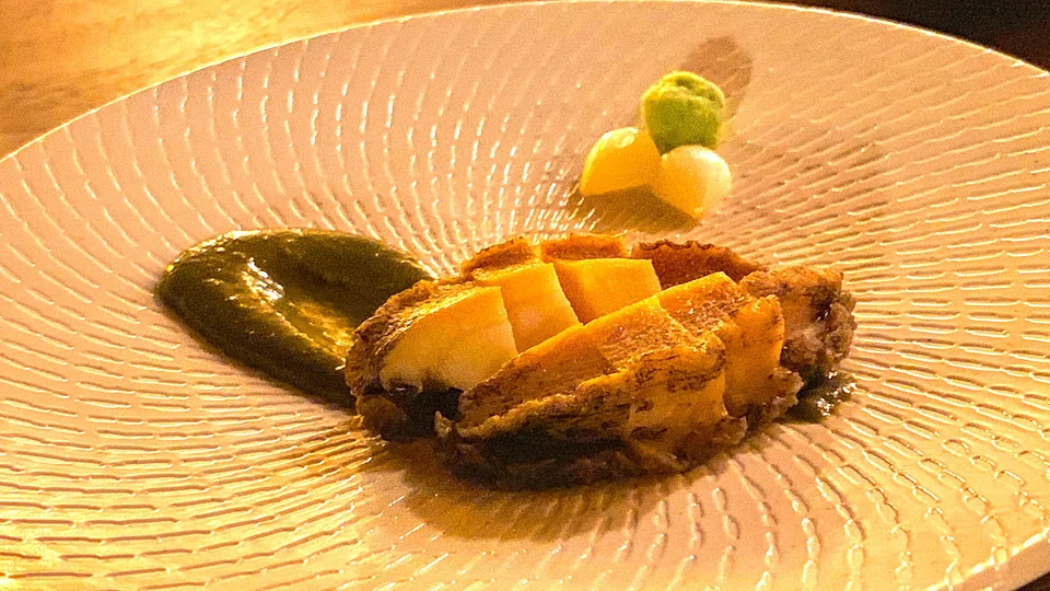 As we entertain fantasies of walking into the set of a Korean action movie with Hyun Bin waiting in the wings to engage in fisticuffs with said Mr Brawn, we're fed with the first course of our omakase menu. It's not the strongest start - a cup of thick pumpkin soup that has you spooning up mouthfuls of baby food.