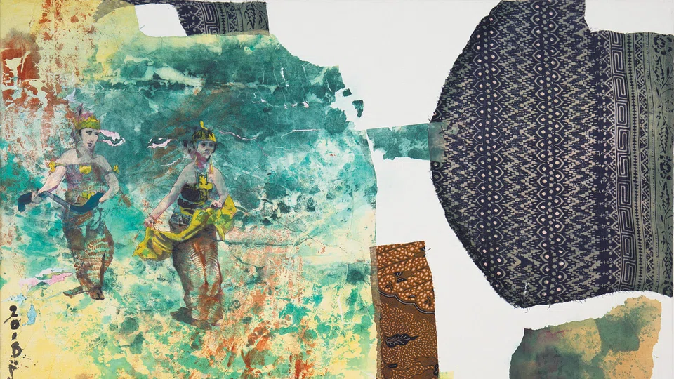 Many of the works combine Lim's flair for landscape and figurative abstraction with the earthy colours and motifs of batik. Unusual for his style, the works also feature generous white spaces between strips of collage, which heighten the details of the subjects.
