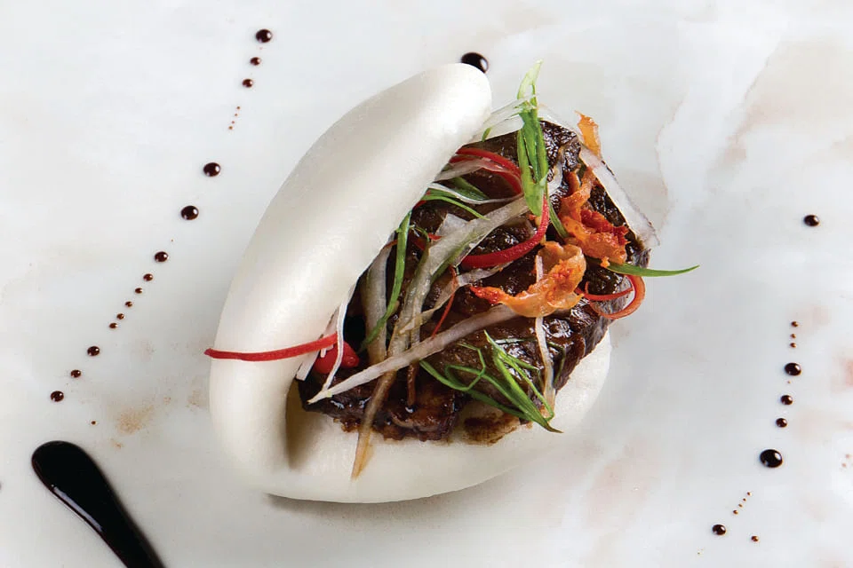 Once we get past fresh and familiar (our exceedingly pleasant server who takes pains to explain each dish, suggests that we order something from each category), spicy and umami territories are filled with edible land mines that we step on more often than not. There's potential for the kong bak pau-inspired braised beef brisket and kimchi in pillowy mantou buns (S$14) if they braised the dry and stringy brisket slices to the same melting tenderness of the original braised pork. Instead, the perky Korean spicy sauce that drenches the beef goes to waste.