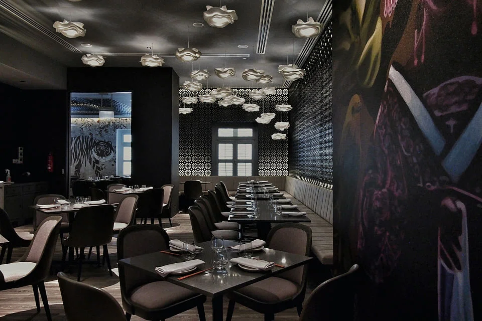 But when you've spent 14 years in the business - 11 of them in tourist-entrenched, style-devoid Clarke Quay, who's to blame you for going hog wild in designing your new persona? Especially when you have a vast second floor space at CHIJMES to fit out, and a whole year to work on it. And so it is that the new Coriander Leaf looks expensive and designer-ish - in the eclectic way of one who likes too many different looks and can't decide on just one. Broody, dark interiors? Check. Dramatic wall murals done by graffiti artist that's so hip now? Check, even if the place is too dark to really appreciate the details of this stylised Peking opera performer painted with x-ray effects. Fancy heritage-style tiles and whimsical lamps? Got it. Do a large panel of tiles above the open kitchen and on accent walls, and hang the lamps all over the ceiling. Oh, and there's that strong colour contrast thing too - with bright red bar stools to counter the dark grey. In fact, everything looks really nice on its own, but put them all together and you suffer a serious bout of designer intoxication.