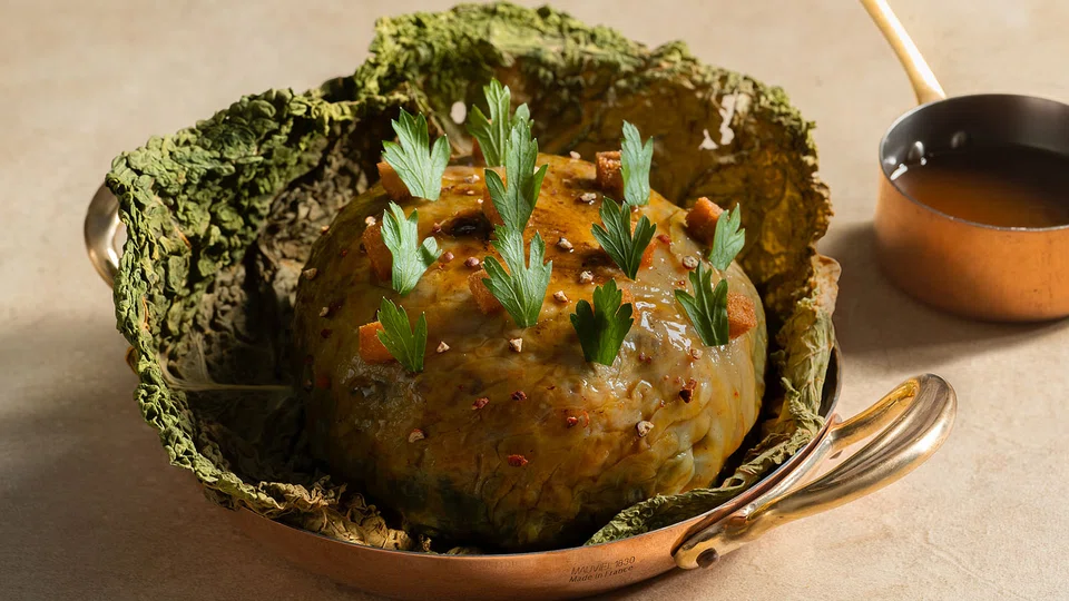 A whole cabbage is cooked for a long time in a sturdy pot - it's shown to you and then returned artfully sliced to reveal tender leaves layered with chopped cabbage and carrots, fluffy foie gras and tender pork sausage meat. Crunchy croutons and an intense, salty-syrupy jus reduction finish it off. It's said to be an Autumn dish designed to warm bellies on a cold day. Here, it's turned into elegant fare with luxe ingredients, but the warm tummy feeling remains.