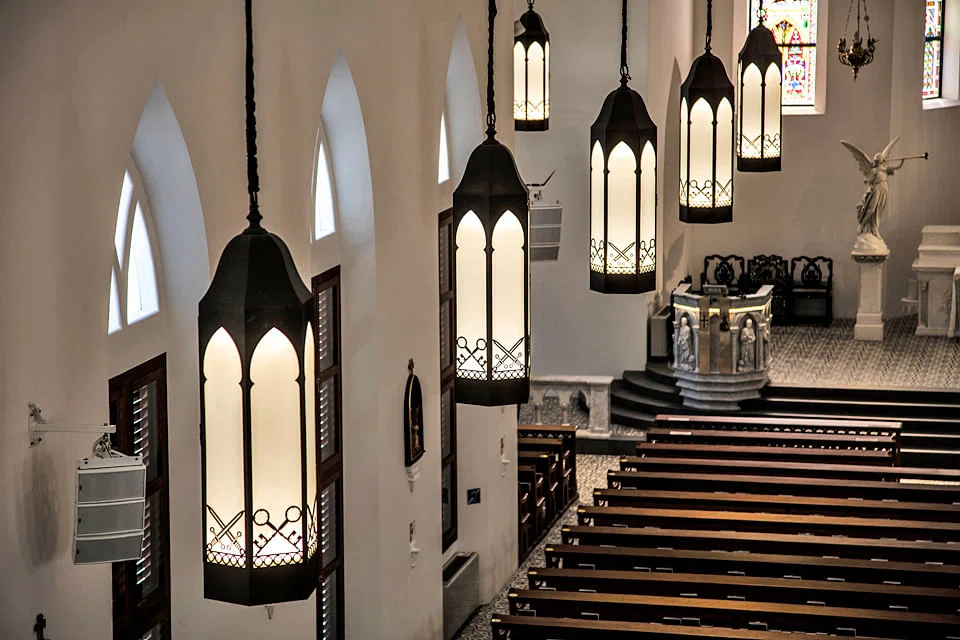 A corrugated metal roof was chosen in order to retain the original century-old roof structure. "The walls of the church would not be able to bear the weight of clay roof tiles," says Ms Soh. Changing of the roof had to be done in stages, which made it time-consuming and labour-intensive. What's new in the church are new amenities such as improved sound systems and floor-mounted air-conditioners and specially designed lanterns in place of the hideous fluorescent lights used previously. On the outside, strategically placed LED lights light up the church at night, giving it a warm glow.
