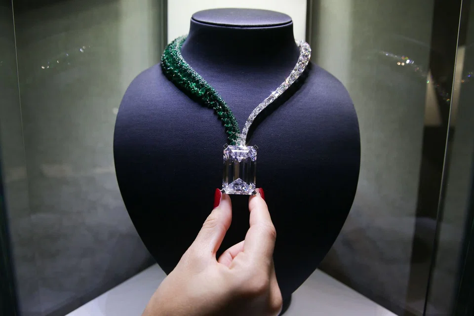 The 163.41-carat flawless D colour diamond, suspended from an emerald and diamond necklace called The Art of Grisogono, sold for 33.5 million Swiss francs (S$45.9 million), after taxes and commissions, at the Christie's autumn jewel auction.