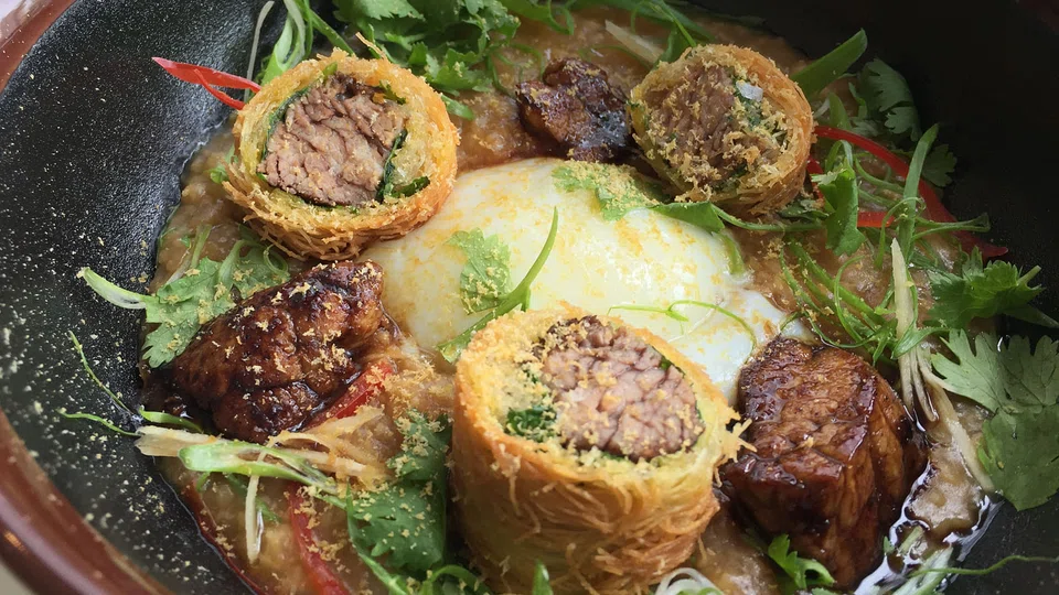 The chef's most far-out creation would be the very original short rib congee and veal sweetbreads (S$17), which takes the idea of rice porridge and egg and throws convention out the window. So you get thick rice congee cooked in a savoury braised short rib gravy, with a sous vide egg in the middle. It's garnished with short rib meat tucked into crunchy, shredded filo pastry and deep-fried, while pan-seared veal sweetbreads give a bit of a foie gras effect. It's weird, but once you break the egg and swirl it into the congee for a rich smooth mouth feel, and counter it with the crunch of the short rib "nest" and rich sweetbread, all your comfort-food markers are met.