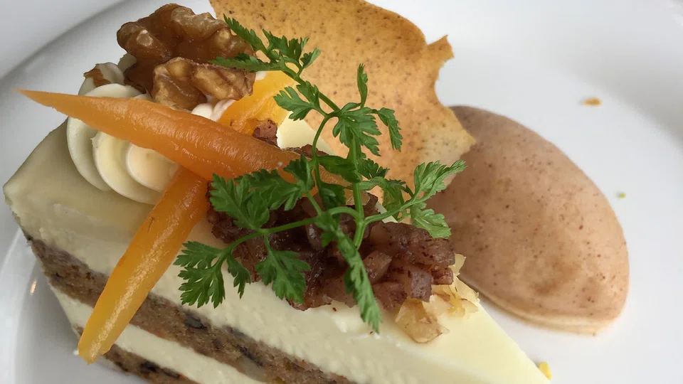 The carrot cake (S$8) with cinnamon sorbet and chai poh fares only slightly better; the cake sandwiches stiff cream-cheese frosting and is garnished with real chai poh (preserved radish) soaked and cooked in sugar, which is more gimmicky than useful.