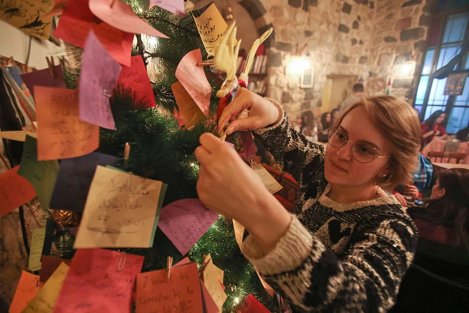 Instead of tinsel and baubles, the Christmas tree is decorated with a simple string of lights and dozens of coloured squares bearing the hopes and prayers of Damascenes, war-weary after nearly seven years of conflict. "I hope all my displaced friends come back as soon as possible," reads Ms Hammoud's invocation.
