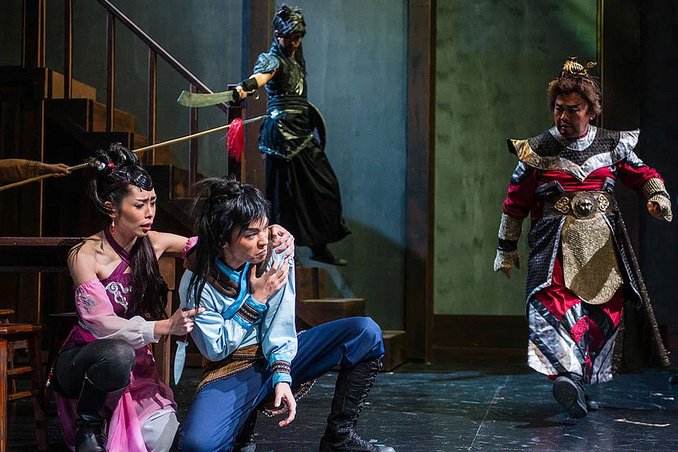 The elegant set designs by Wong Chee Wai include two houses, a tavern and a bamboo forest that stylishly evoke ancient China. Swordsmen and bandits break into fights that have been stunningly choreographed within the inch of their lives by Gordon Choy. Moe Kassim's gorgeous period costumes and Ashley Lim's hair design and headgear would not look out of place in a classic wuxia picture.