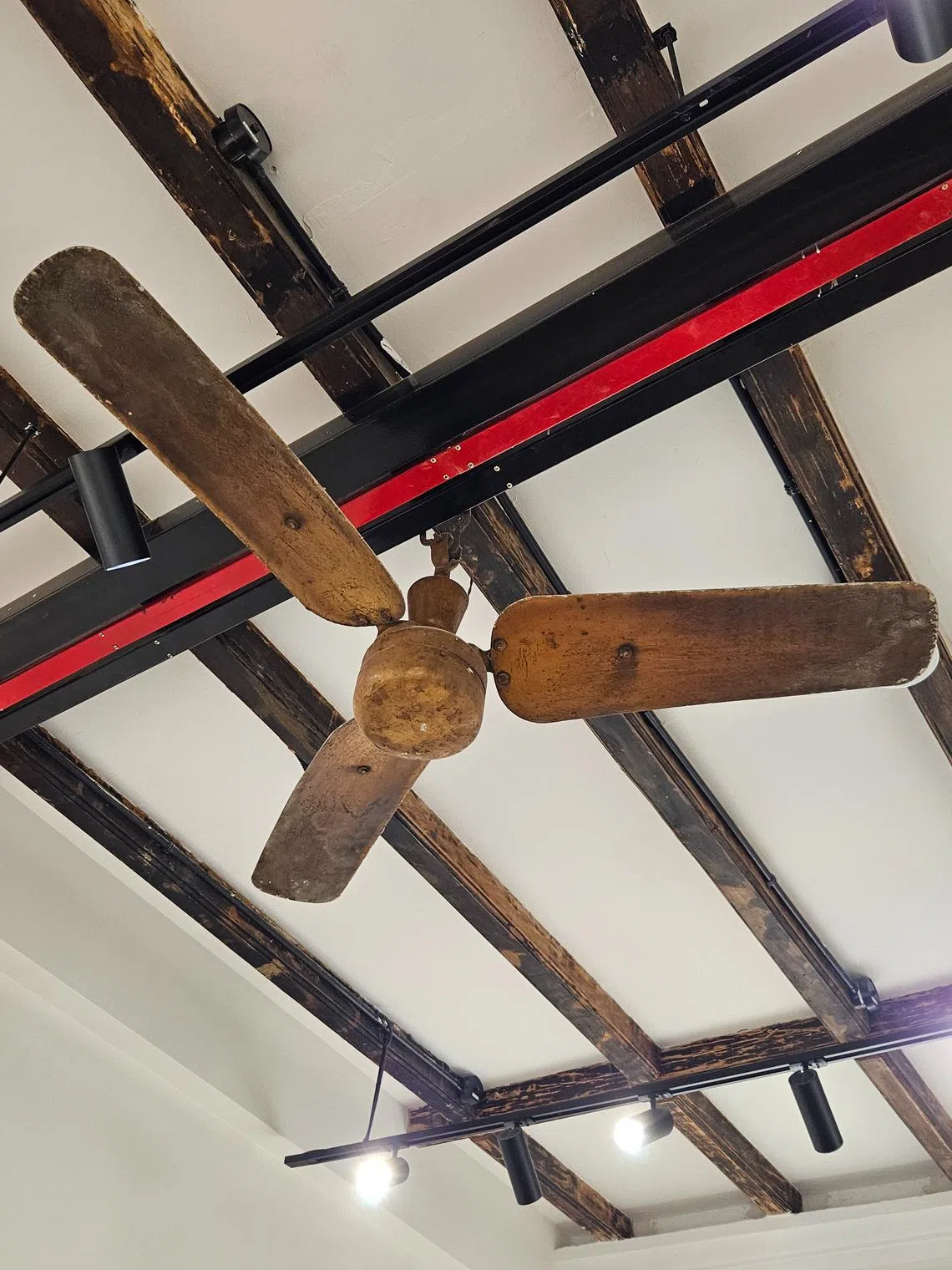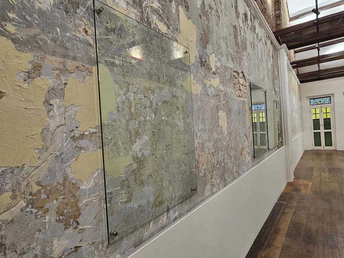 Hence, an old fan that no longer works still hangs from the ceiling, like a silent witness of the eras gone by. Newspapers on the third-storey walls were kept – and protected behind glass panels. The different layers of paint and plaster, nail holes and portions of exposed brick have also been retained as windows into the shophouse occupants’ past.