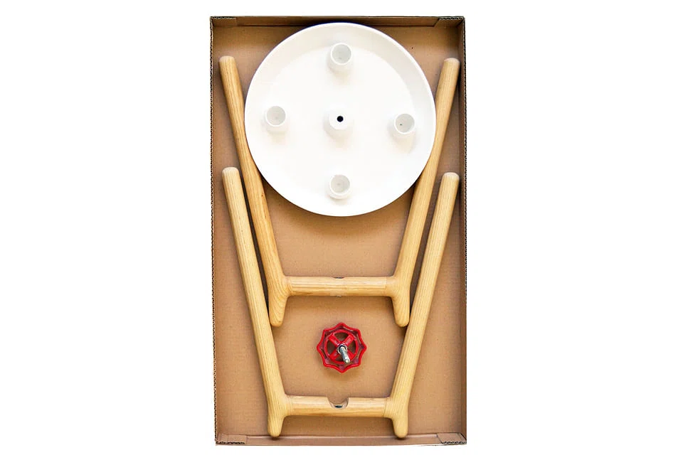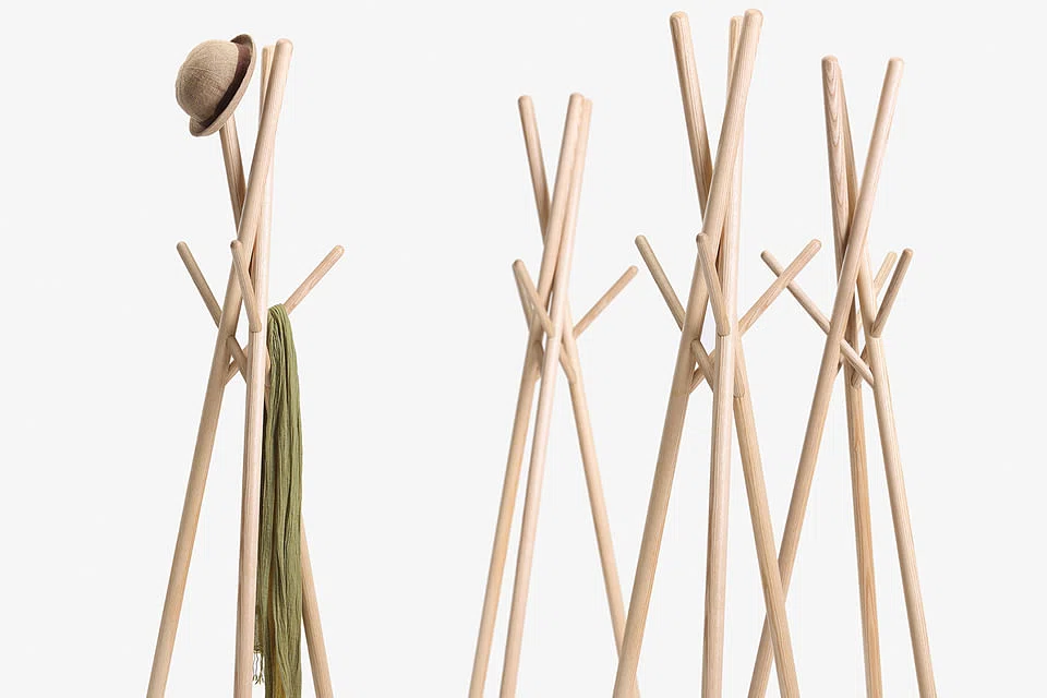 the Nude Coatrack, which attempts to strip things down to the bare basics. The flat-packed coat rack comprises six lengths of wood that can be assembled without instructions. The different pieces of wood are inserted into each other to form the rack, without the need for any metal parts. The production cost of Nude Coatrack is 50 per cent lower than other coatracks on the market.