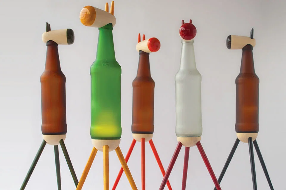 Meanwhile, Animal Farm is a series of lamps designed with the twin themes of craft revival and the re-purposing of used glass bottles that don't make it back into the recycling chain. These upcycled bottle lamps take on animal forms, shaped from pieces of wood, made by local craftsmen in Karnataka, in South West India. By bringing this dying local craft and the cause of re-purposing together, Animal Farm tries to provide an ecologically conscious solution.
