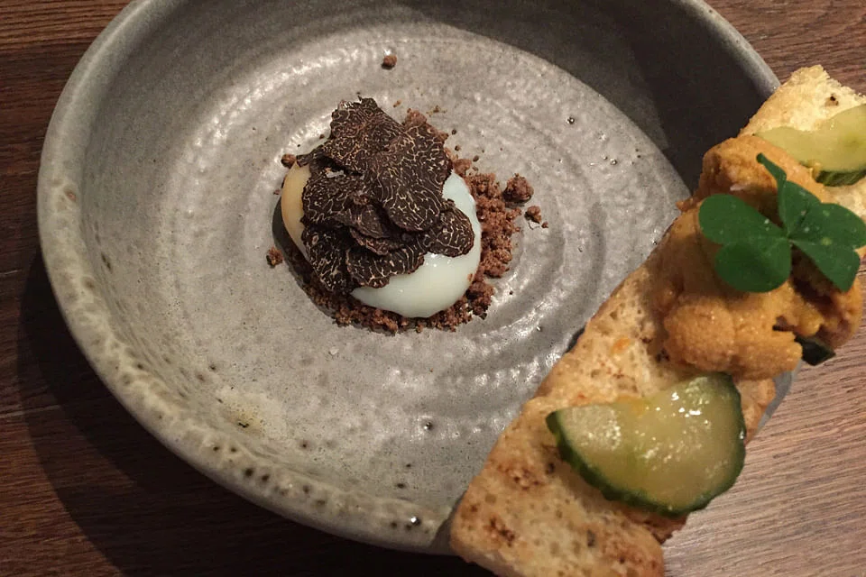 The best dish of our evening there is a blackboard special - soft-cooked egg (S$28) sitting on savoury, earthy porcini mushroom crumbs, showered with wafers of Aussie black truffle, with a surprise dollop of uni on toast. Whichever way you attack it still ends in a mouthful of joy - the rich creaminess of the egg and sweet fresh uni plus the mushroomy match of truffles and porcini, all reined in by the sweet piquancy of pickled cucumber.