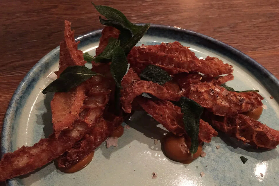 Many of the dishes that we were enamoured with from 5th Quarter are no longer there. A fair number remain, though, albeit with different descriptions and condiments, perhaps to rationalise charging S$15 for fried tripe with togarashi, Szechuan pepper and caponata puree. The old salt and pepper tripe used to set you back by S$10. We've heard much about this dish - slow-cooked offal deep-fried for an engaging crunchiness, while the peppers anaesthetise your tongue. We like the way it starts - like chewy pork crackling - but not the way it ends on a gamey note.