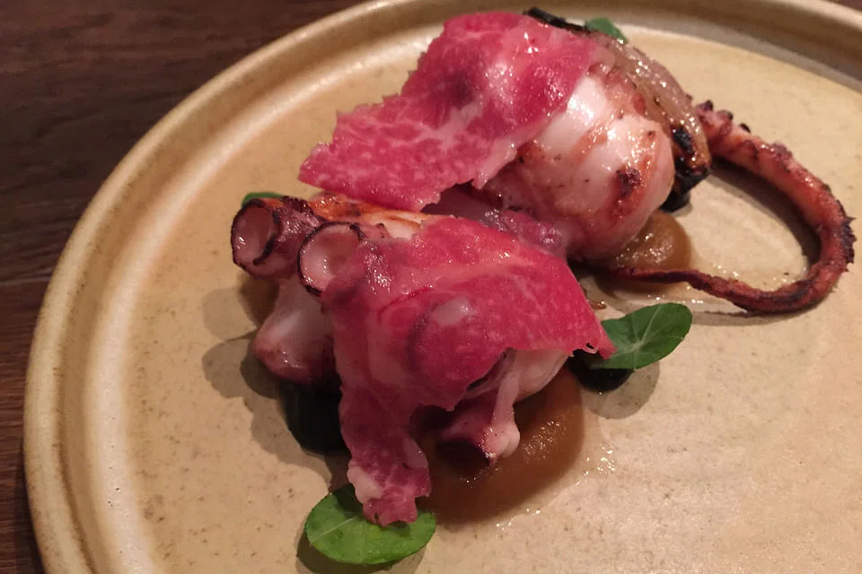 Then come our seafood missteps: a thick, meaty hamachi collar (S$28) that's slightly off its peak, with a bitter edge to the burnt skin that clashes with the smooth lardo draped over it. A carpet of fried basil sits on top, and a puree of kale all add up to an awkward match. And weirdly, the same octopus (S$28) we enjoyed as part of the set lunch the other day falls flat at dinner time. Maybe because the octopus doing the evening shift is bulbous, bloated and squelchy compared to the lunchtime thin, tender strips covered by a shower of finely shaved raw wagyu. Black squid ink sauce and caponata cream should pull everything together but at night, it's like a different dish altogether.