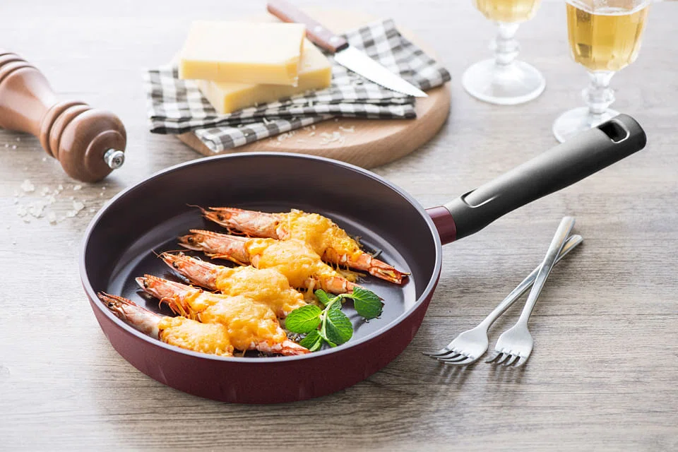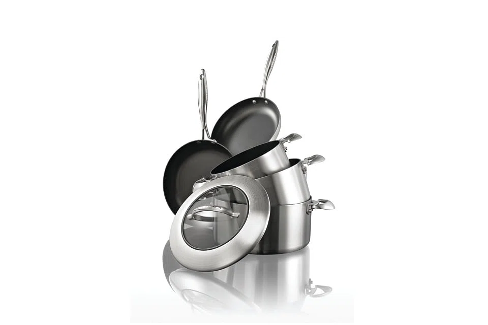 Aluminium is an efficient conductor of heat, it's fire resistant and rust-free. However, aluminium is a soft metal and can be easily scratched and dented. It can also react with certain foods which is why it is usually sandwiched between other metals. Over time, a grey tone can form but this discolouration would not affect its usability in any way. Some aluminium cookware is also often treated through a process known as anodisation, where a layer of aluminium oxide is put on the surface to make it scratch-resistant and not reactive with foods. Aluminium cookware is often finished with a non-stick coating to guarantee food remains unburned.