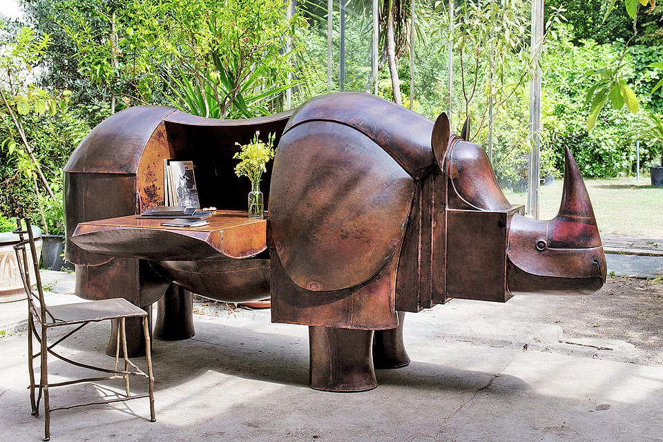 Brown, seated in the front row of the salesroom, gave the second-highest bid for "Rhinocrétaire", the most expensive lot in the auction. "It was the bargain of the sale," he said. "It was a masterpiece." The desk was a unique item by François-Xavier Lalanne, but most works included in Sotheby's auction were editioned pieces, typically made by Les Lalanne in series of eight.