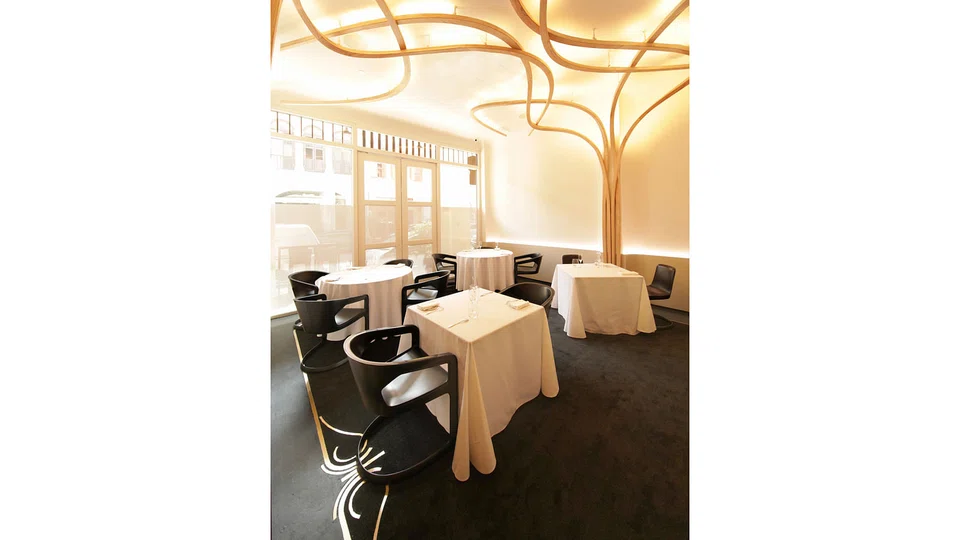 There's a sense of deja vu as we step into the compact dining room, which is now repainted in a stark white with purple accents and chairs. Wooden strips creep and curl along the walls and ceiling like an almost sinister tree root formation that might reach out and snare you. But relax - it's just "a contemporary interpretation of art nouveau woodwork".